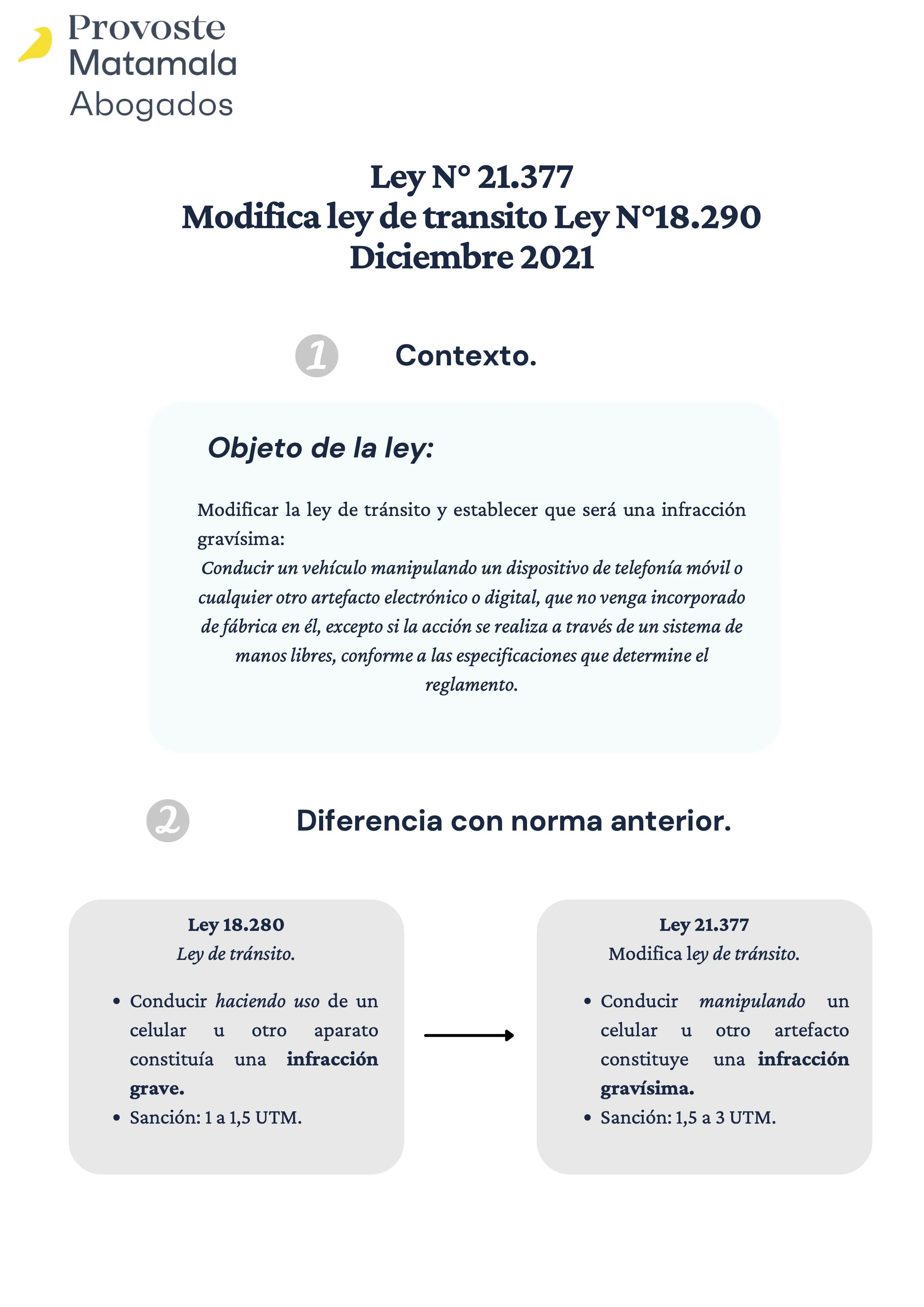 Modificación a la Ley Nº 18.290 de tránsito 22 dic Escrito por Daniela Pinto Ortega Santiago de Chile, 22 de diciembre del 2021La Ley Nº 21.377 retipifica como infracción gravísima manejar utilizando dispositivos electrónicos, lo que endurece la pena establecida para esos casos. Revisa nuestras recomendaciones a los empleadores. Descarga nuestra gráfica ley 21.377ley 18.280ley de transito Daniela Pinto Ortega